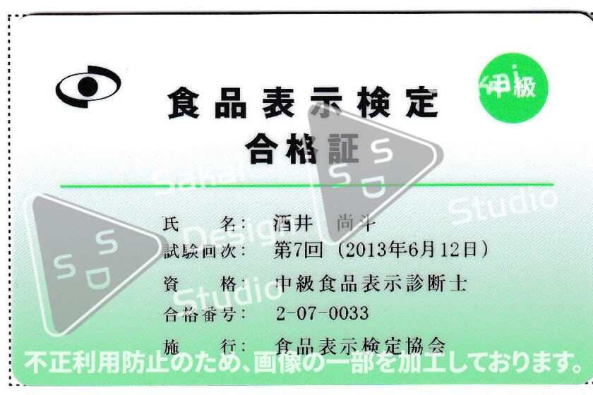 食品表示検定中級の資格を取得しております